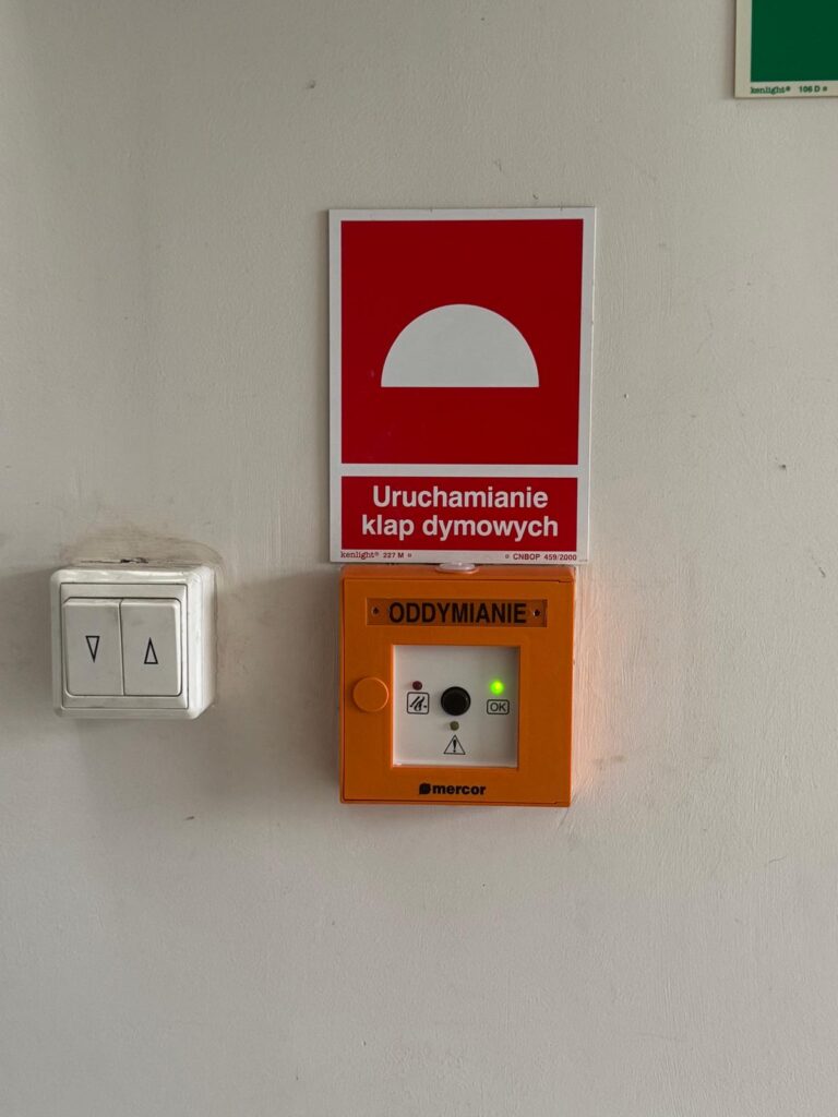 - ręczne przyciski oddymiania (znane wszystkim z klatek schodowych w budynkach mieszkalnych),